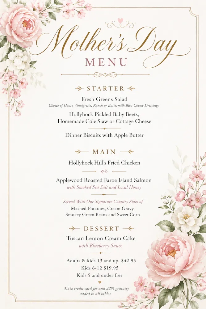 All entrées below start with sweet pickled beets, house salad, and biscuits and apple butter.